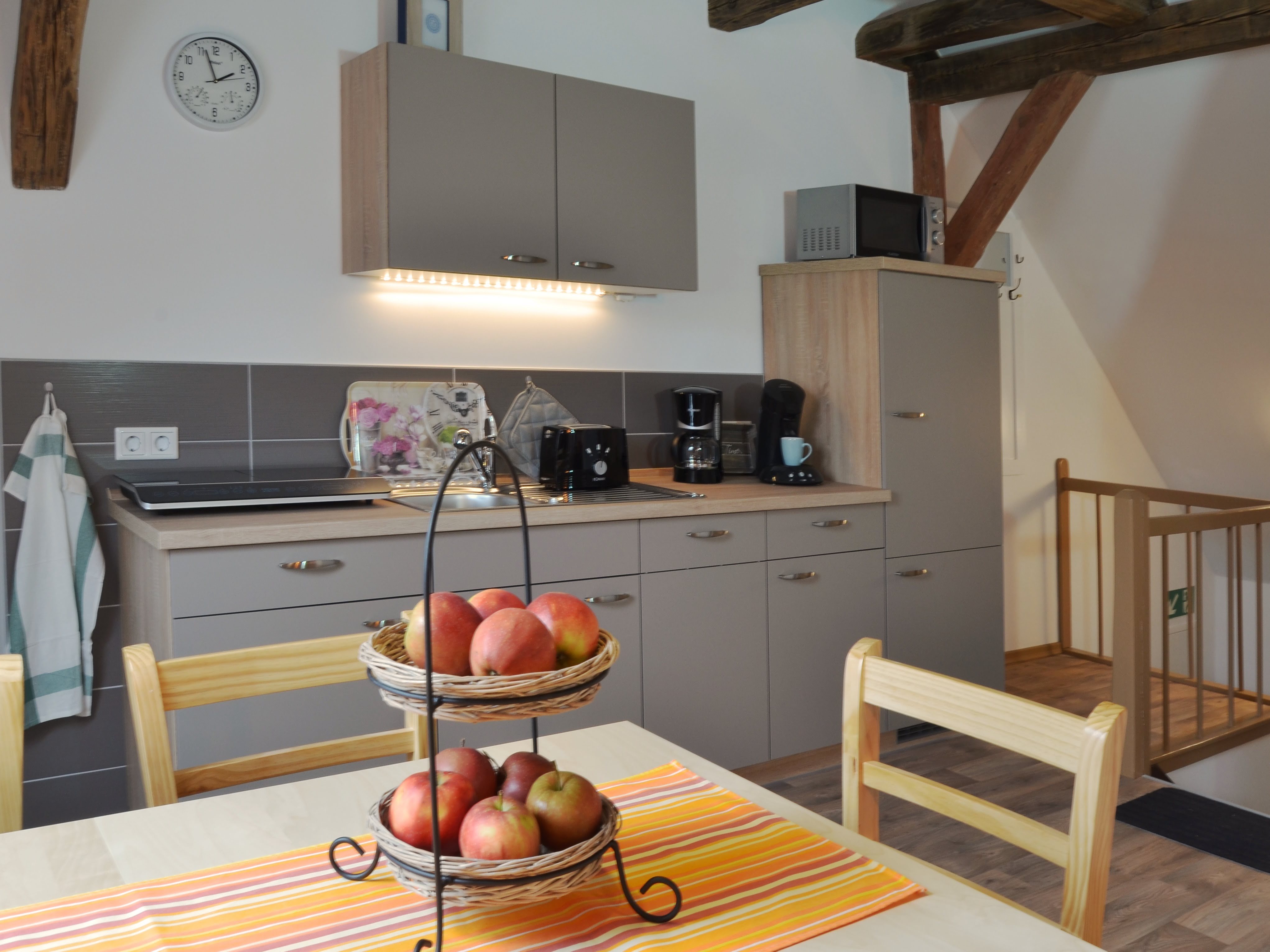 • 4 Räume: Wohnzimmer mit Einbauküche, Schlafzimmer, Schlafebene, Bad mit Dusche, Toilette separat