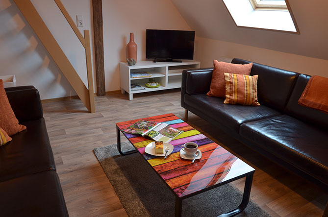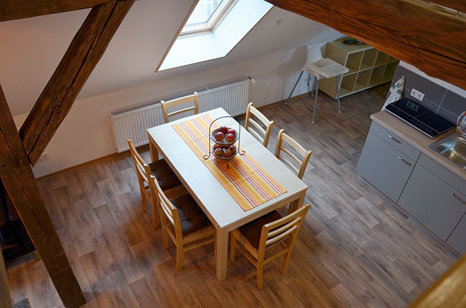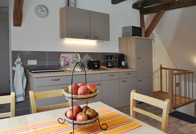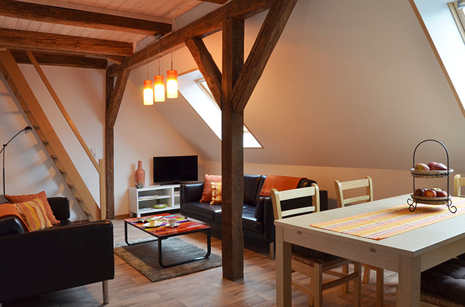 Die Ferienwohnung "JONAGOLD" befindet sich im Dachgeschoss des Hauses und ist über den gemeinsamen Hausflur erreichbar (Zugang nicht barrierefrei).