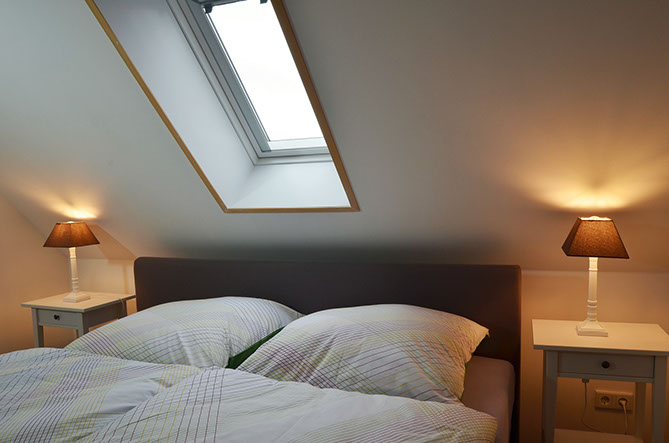 separate Bettdecken, Velux-Fenster mit Verdunklungsrollo, abgetrennter Bereich