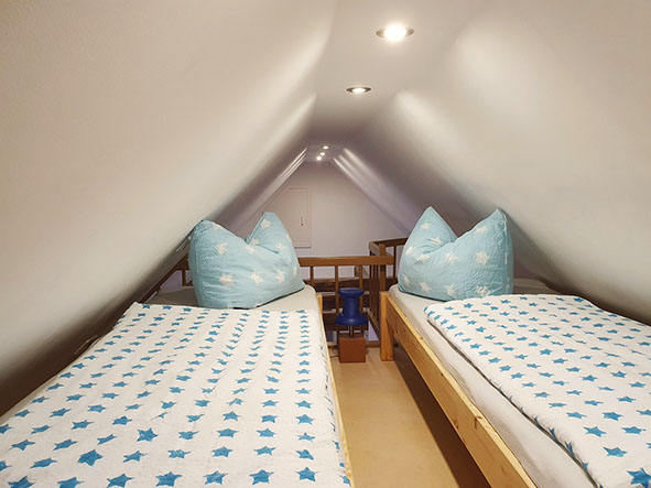 2 Einzelbetten 200 x 90 cm im Spitzboden - über eine Raumspartreppe aus dem Wohnzimmer erreichbar